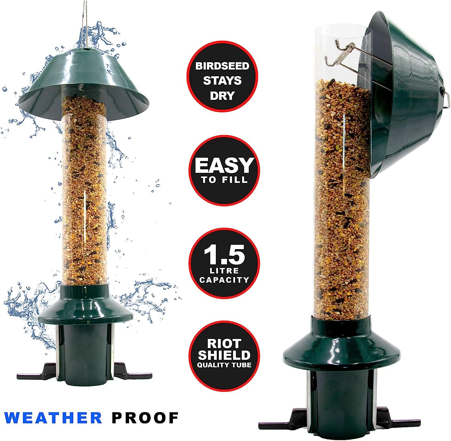 • SO SIMPLE TO USE AND FILL – Simply open the lid and fill. No need to take the whole feeder apart to fill. The PestOff bird feeder simply ‘clicks’ apart for easy cleaning, no nuts and bolts to remove and replace. Seed container is made from thick UV stable Polycarbonate.