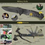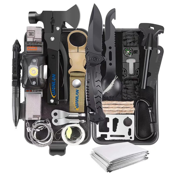 - 【Must Have Survival Gear and Equipment】29 in 1 XUANLAN survival kit contains everything you need when there is any emergency situation occurs. 29 popular camping accessories and survival gear in the kit: 15 in1 Hatchet, LED Headlamp, Tactical Pen, Bottle Hanging Buckle, 8 in1 Multi-use Spork, Survival Bracelet, Fire Starter, Fire Starting Stick, Climbing Hooks, Multifunctional Card, Wire Saw, Emergency Blanket, Fishing gear, Keychain Screwdrivers.